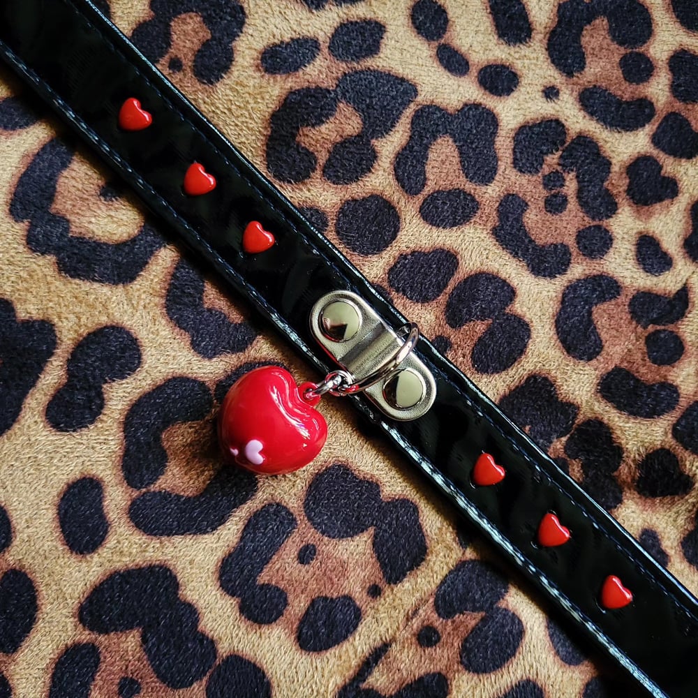 Vegan leather collars with bells on! Handmade with heart studs and hand etched stainless steel DeDPuSs tag — you can be a cat too!
